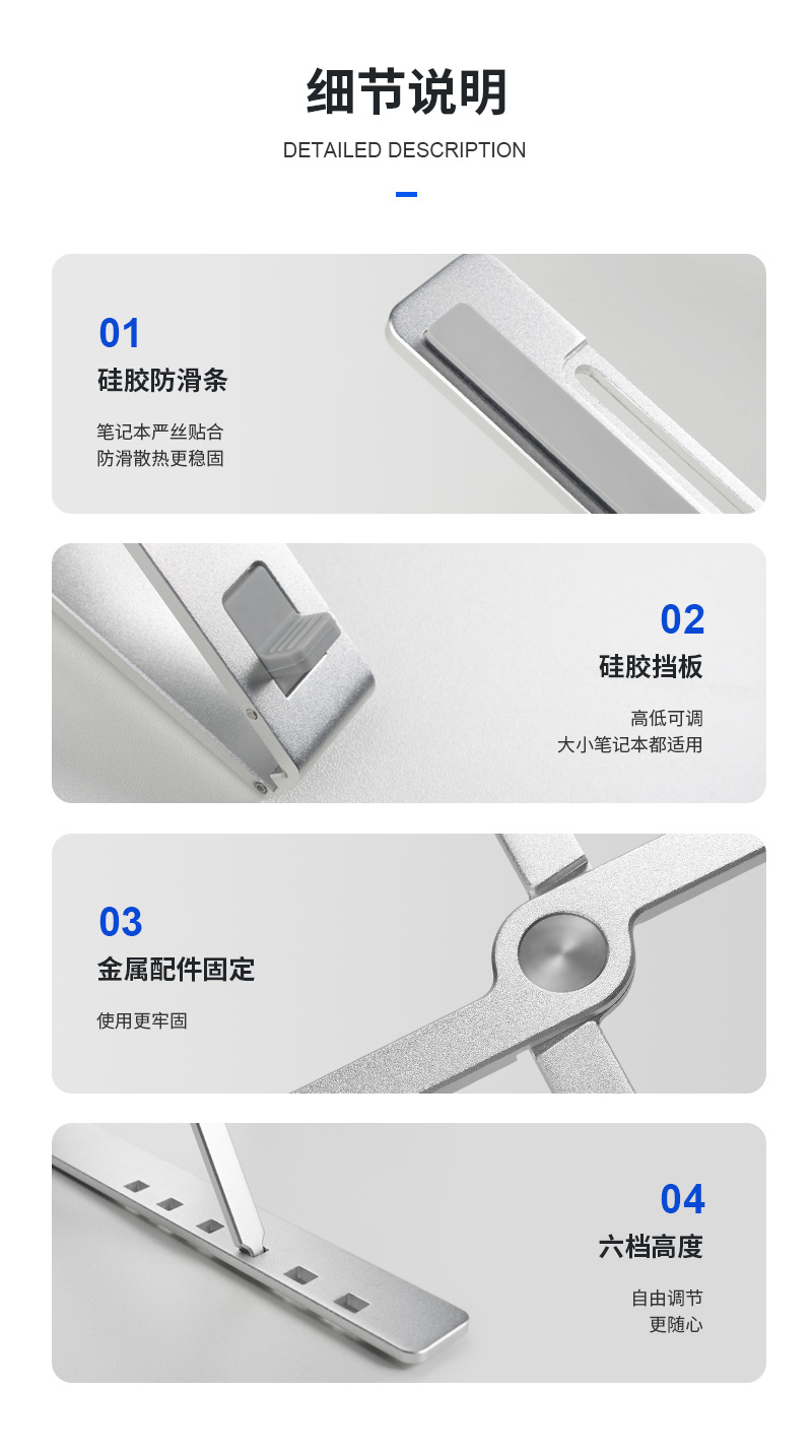 這款筆記本X散熱支架,以簡(jiǎn)約,可收縮折疊,易攜帶為主要賣(mài)點(diǎn),所以設(shè)計(jì)風(fēng)格定位為以簡(jiǎn)約清新的輕奢辦公風(fēng)格來(lái)設(shè)計(jì),詳情設(shè)計(jì)包括的項(xiàng)目?jī)?nèi)容有:詳情的整體設(shè)計(jì),展示邏輯,文案策劃篇寫(xiě),產(chǎn)品拍照,應(yīng)用場(chǎng)景拍照,美工設(shè)計(jì),主圖設(shè)計(jì)。