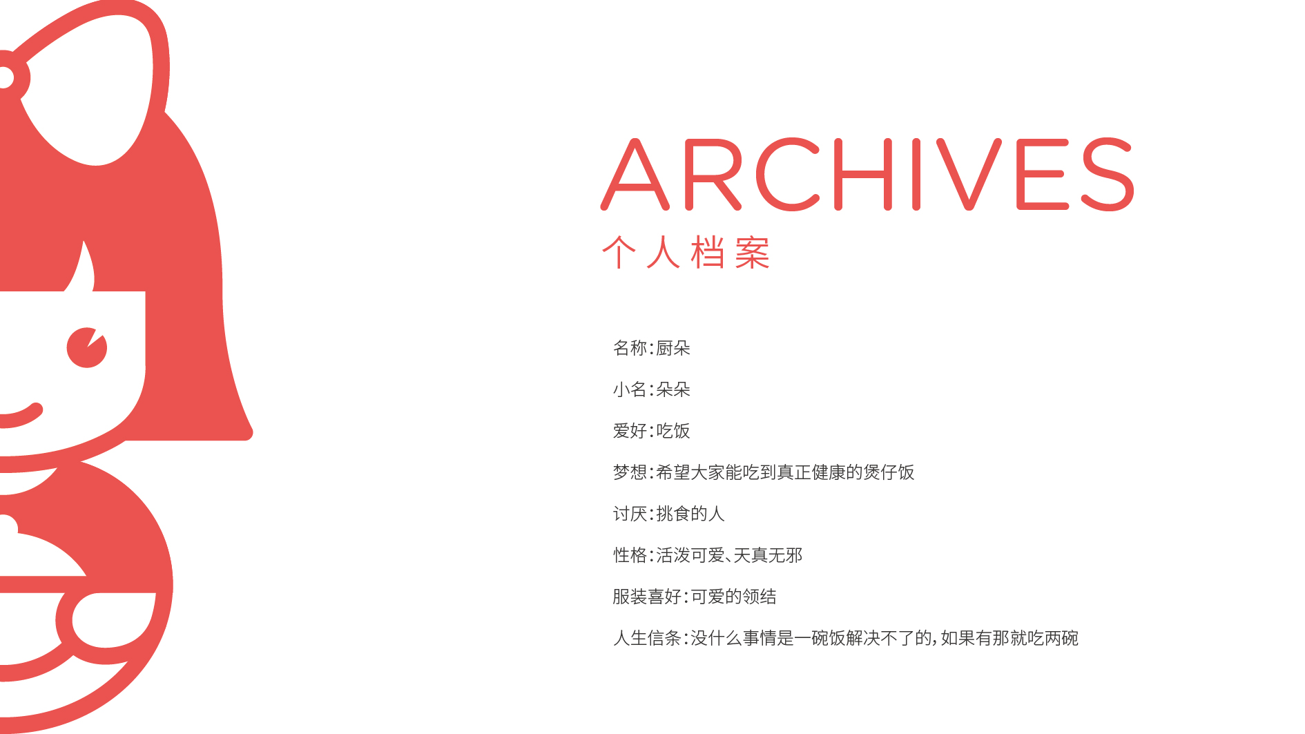 本標志的設計直接從品牌名稱的含義切入,將其塑造成一個健康、活潑、可愛、好吃的小女孩形象-朵朵。 吃飯的女孩露出了燦爛的微笑,體現了食物的美味與健康,廚朵帶來的不僅是味覺盛宴更是心情盛宴,領結用以體現熱情、親和的服務和干凈健康的食品保障。 標志的設計簡約而具代表性,很形象的突出了行業的屬性,給人直觀的品牌形象。