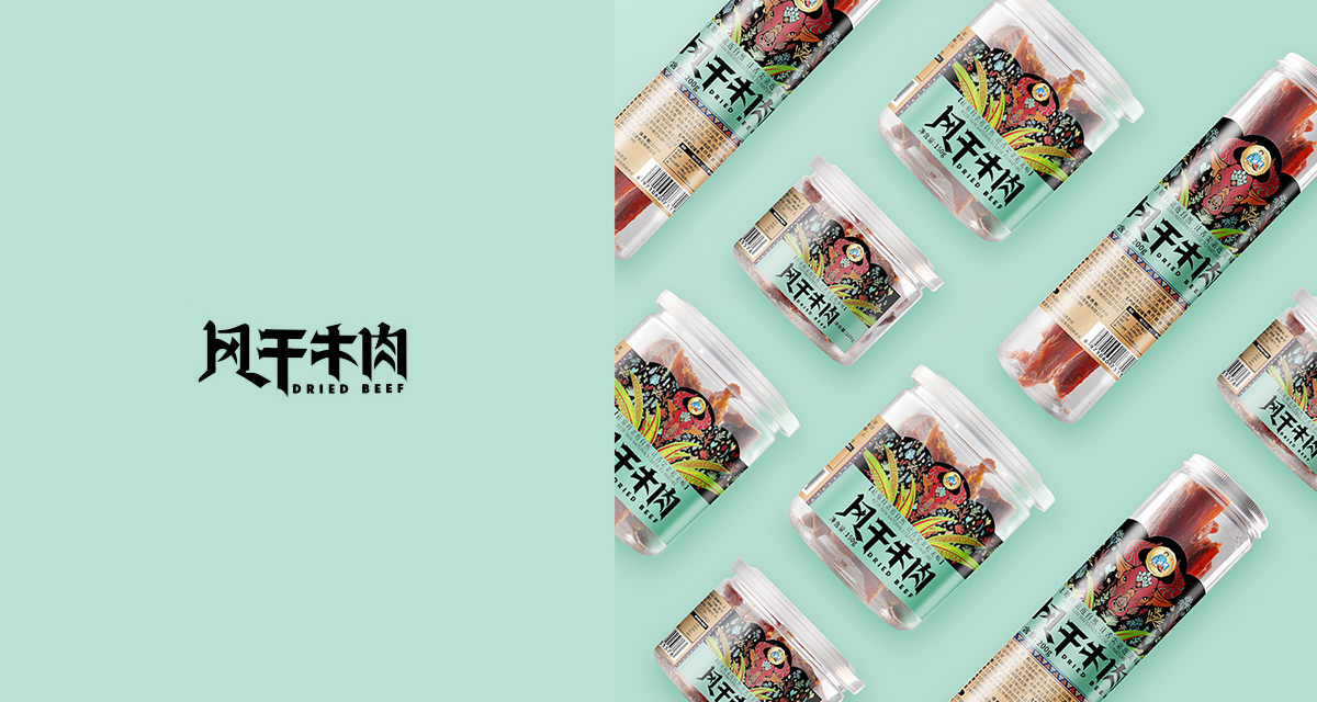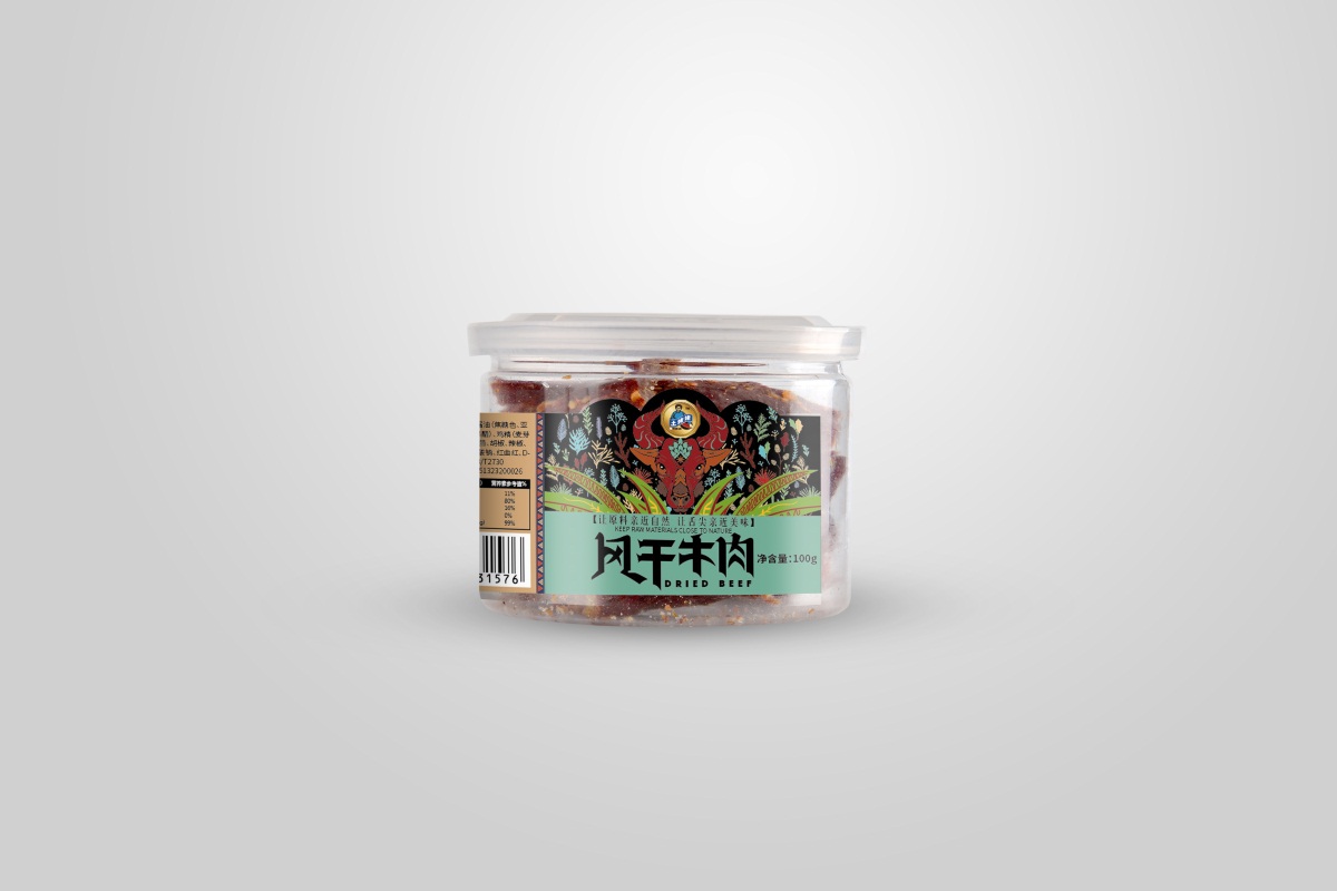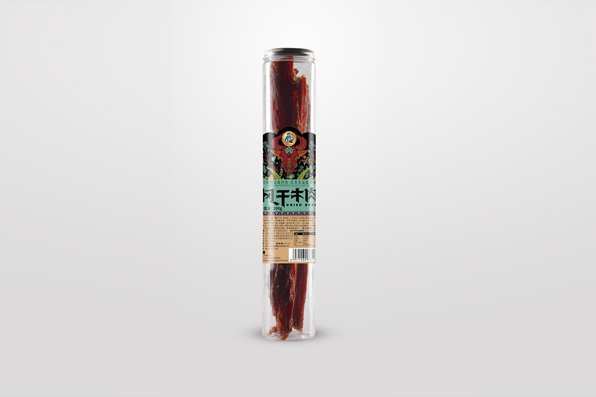 用牦牛肉腌制風干而成的肉干,牛肉干含有人體所需的多種礦物質和氨基酸,既保持了牛肉耐咀嚼的風味,又久存不變質。這款封干牛肉包裝有三個尺寸規格,以筒裝形式為主加標簽設計的形式來呈現,標簽將藏族特色文化元素進行插畫設計,品名字體也根據地方特色進行字體創作,突顯地方特色文化和美食文化,同時又打破傳統的配色,采用比較現代高級的低飽和度色彩為主,以現代休閑食品的風格,拉進與消費者的距離。