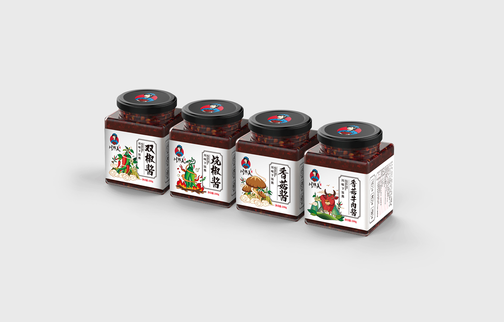 川辣美辣椒醬屬于地方特產類,本方案選用了方形的玻璃瓶+瓶身標簽設計的形式。 來自四川的美味辣椒醬品牌,古風、韻味、親和,從品牌logo設計,包裝瓶的選擇,到系列包裝形象設計,方案將雙椒醬、燒椒醬、香菇醬、香菇牛肉醬四個品類以插畫風格進行創作,以系列感來呈現,品牌感強,接地氣